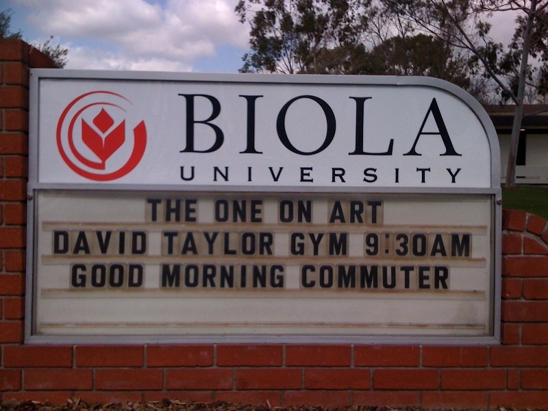 (Sign at the entrance to Biola University on the day I spoke. I had a fabulous time there, by the way. I'll post a note shortly. But the question is: Which "one" on art? Where exactly can I find the "David Taylor Gym"? And was there only one "Commuter" in chapel that day? You could probably write an impressive dissertation on the cultural dynamics of marquee signs.)